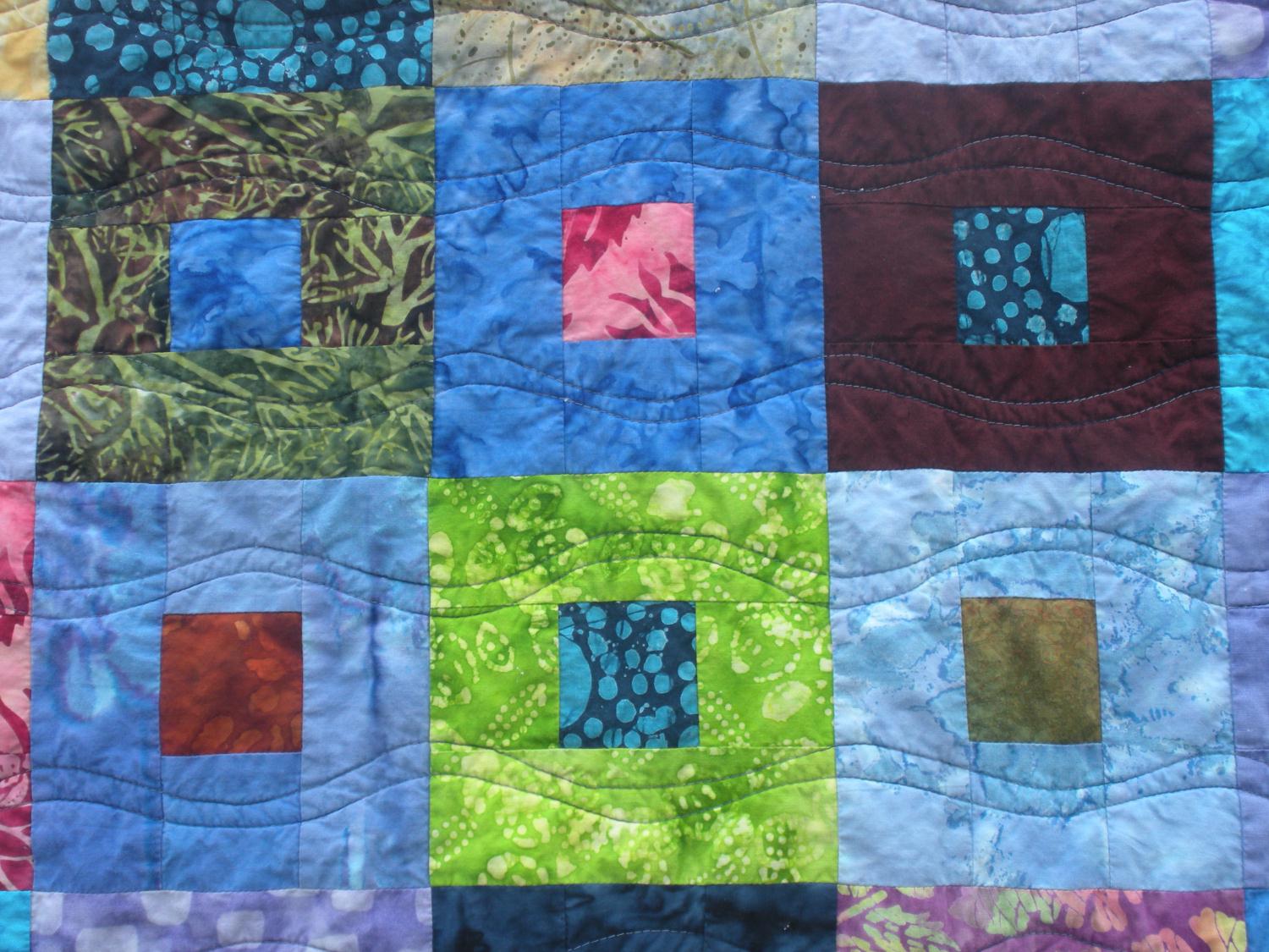 I had lots of fun with this one: the top was easy-peasey using jelly rolls and I had a good time puzzling out how I wanted to piece the back. I used a large version of the same block which gave me the quilt name - "Thick and Thin." Then the quilting stumped me in various ways until I remembered I could use different colored threads on front and back and didn't have to go straight geometric just 'cause the pattern is made of squares. I relaxed and decided to do “wavicles.”